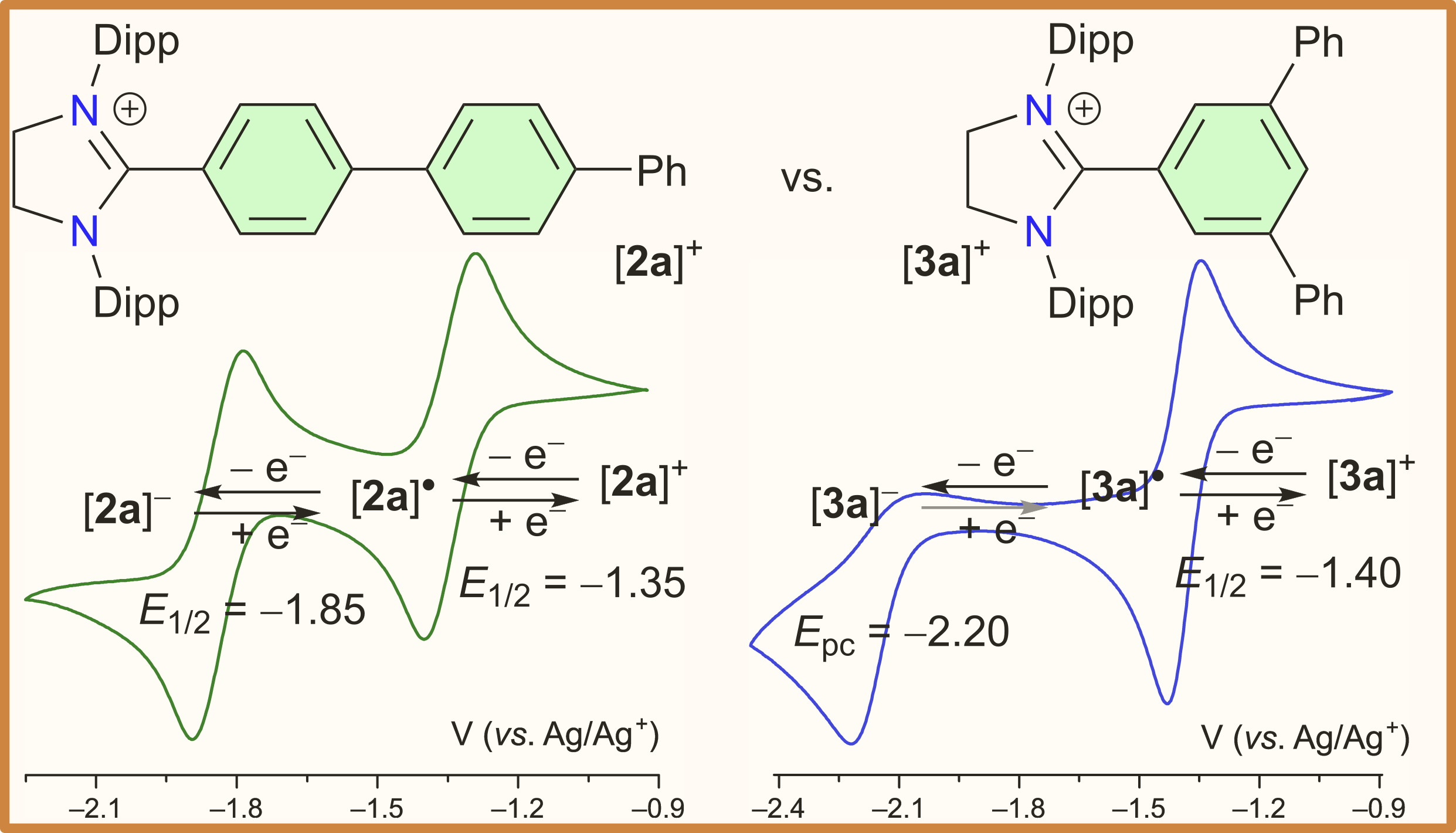 Two series of C2-terphenylated derivatives of three N-heterocyclic carbenes (NHCs) have been reported. The para-terphenylated species exhibit three stable (reversible) redox states (e. g. [2b]+, [2b]●, and [2b]–), while for the meta-terphenylated derivatives only cationic and neutral states (i.e. (e. g. [3b]+ and [3b]●) are reversible.